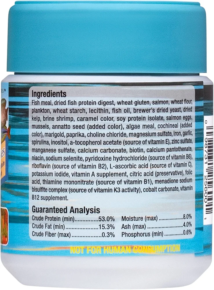 فیلهٔ ماهی قزلآلا، پلانکتون (Euphausia pacifica / کریل)، آرد گندم، عصارههای آمینو و پروتئینهای دریایی، سیر، ویتامینها (از جمله ویتامین C تثبیتشده)، افزودنیهای تقویت رنگ و نگهدارندههای مجاز.